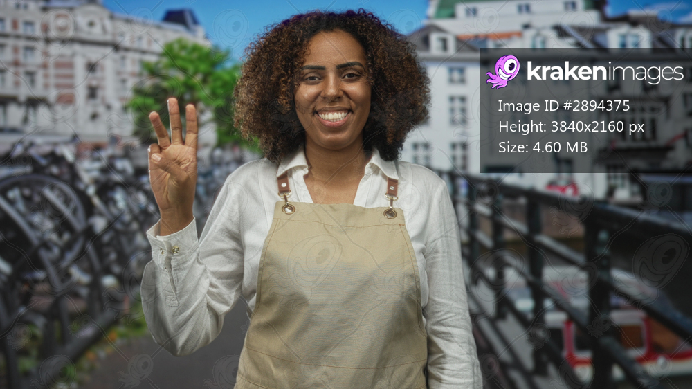 Woman baker wearing apron smiling holds up four fingers on street by an amsterdam canal bridge; artisan craft joy.