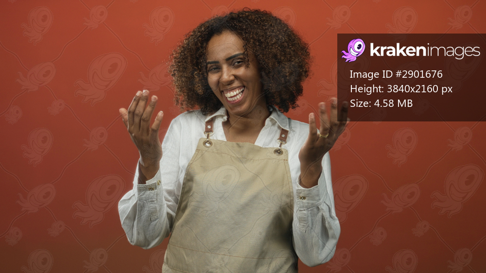 Woman baker wearing apron and white shirt smiling with open hands gesture in orange studio; joy warm welcome.