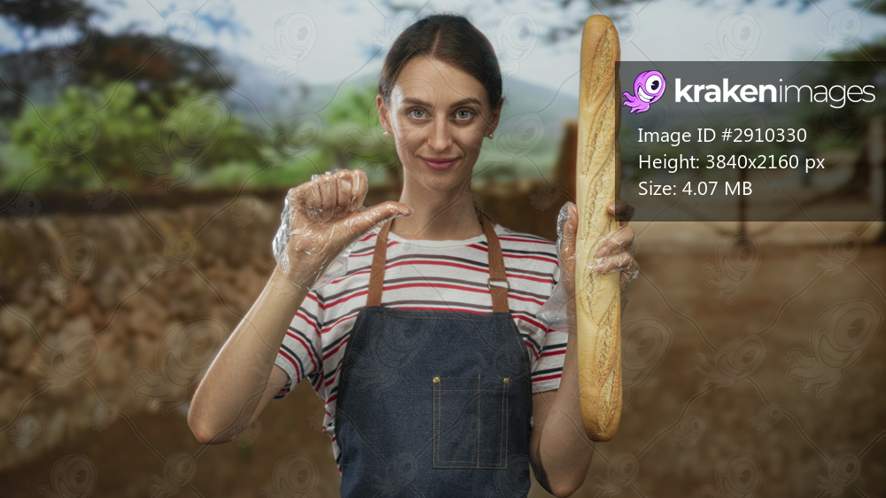 Woman baker wearing denim apron and clear gloves holding a long baguette with thumb pointing to self in forest market; pride craftsmanship.