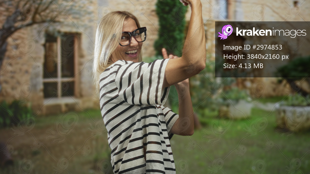 Woman with bare arm raises arm and smiles wearing striped shirt and oversized glasses in front of old stone building; carefree joy.
