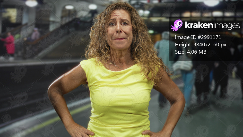 Woman with bare arms by a train, hands on hips and grimacing amid a crowded platform inside a busy building commuter hub; commute frustration.