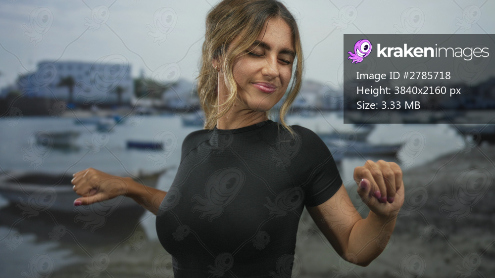 Woman bare arms dancing and swaying at sunlit marina with closed eyes and gentle smile; happiness freedom rhythm.