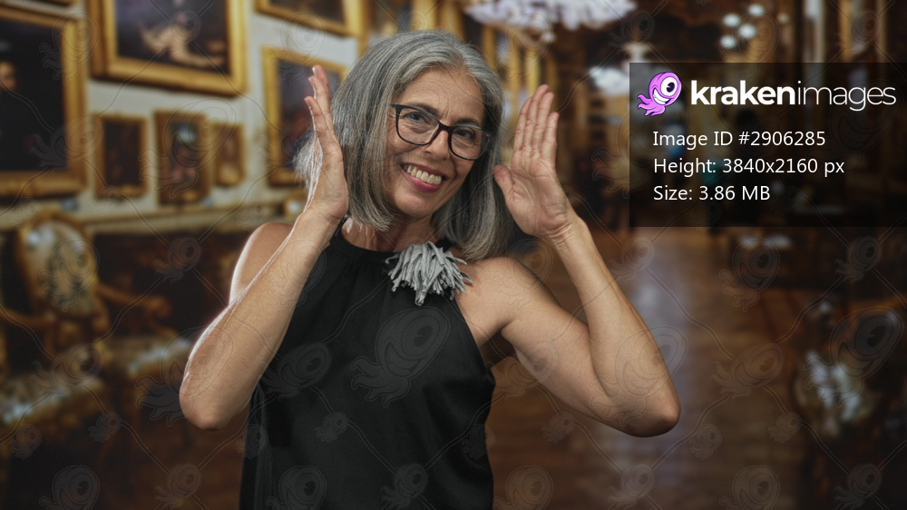 Woman with bare arms and glasses raises hands framing smiling face in ornate gallery building corridor; joy celebration.