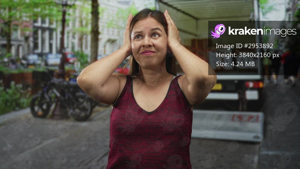 Woman with bare arms holding hands to head on a street beside a delivery truck and parked motorcycles, facing camera; frustration.
