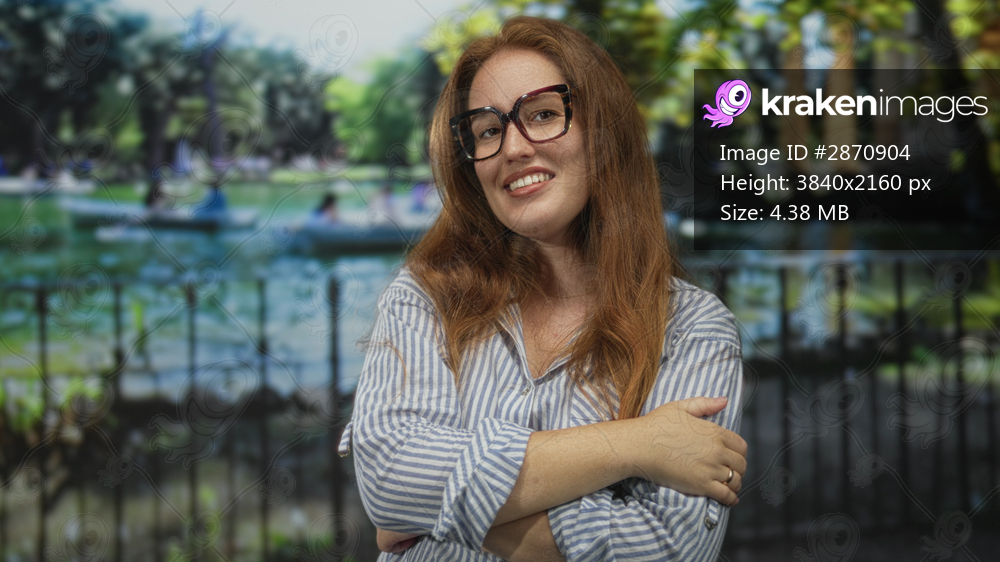 Woman with bare arms hugging herself with arms crossed by lake fence in green park; self care comfort.
