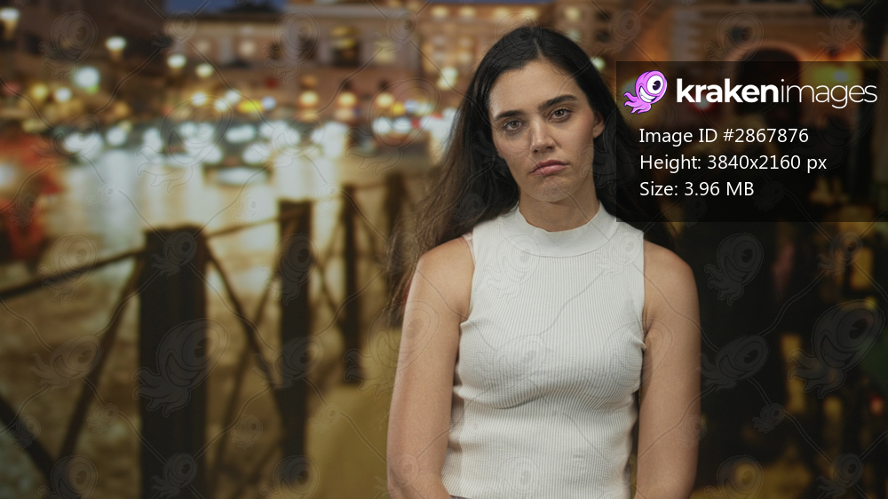 Woman with bare arms and long dark hair frowning under streetlights on busy city street at night; weariness.