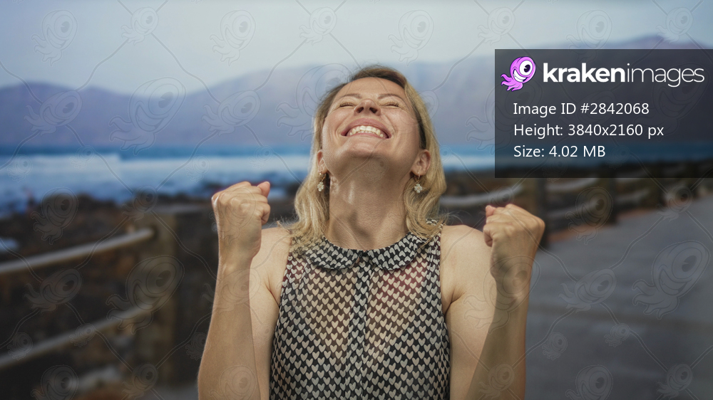 Woman with bare arms pumping fists on seaside promenade with wooden railing near ocean waves and distant mountains; excitement.