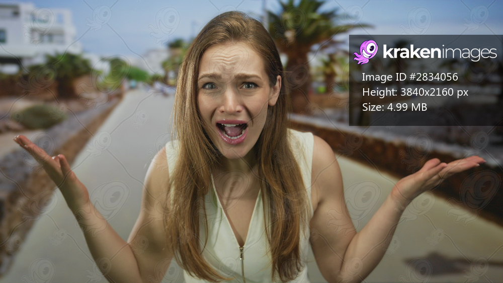 Woman with bare arms raises palms up on sunlit city street lined with palm trees under blue sky; confusion.