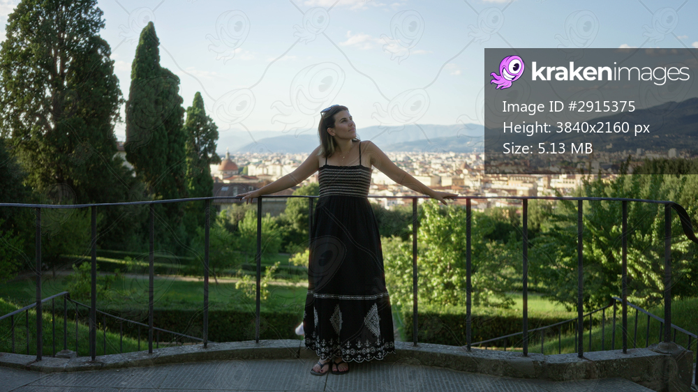 Woman with bare arms resting on an iron railing, looking out over florence city buildings from a viewpoint overlooking rooftops and hills; serenity.
