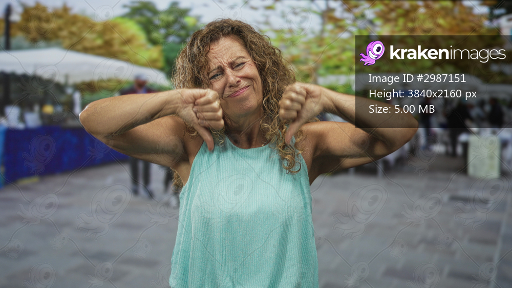 Woman with bare arms showing double thumbs down gesture at a street market with vendor tents and shoppers; disapproval rejection.