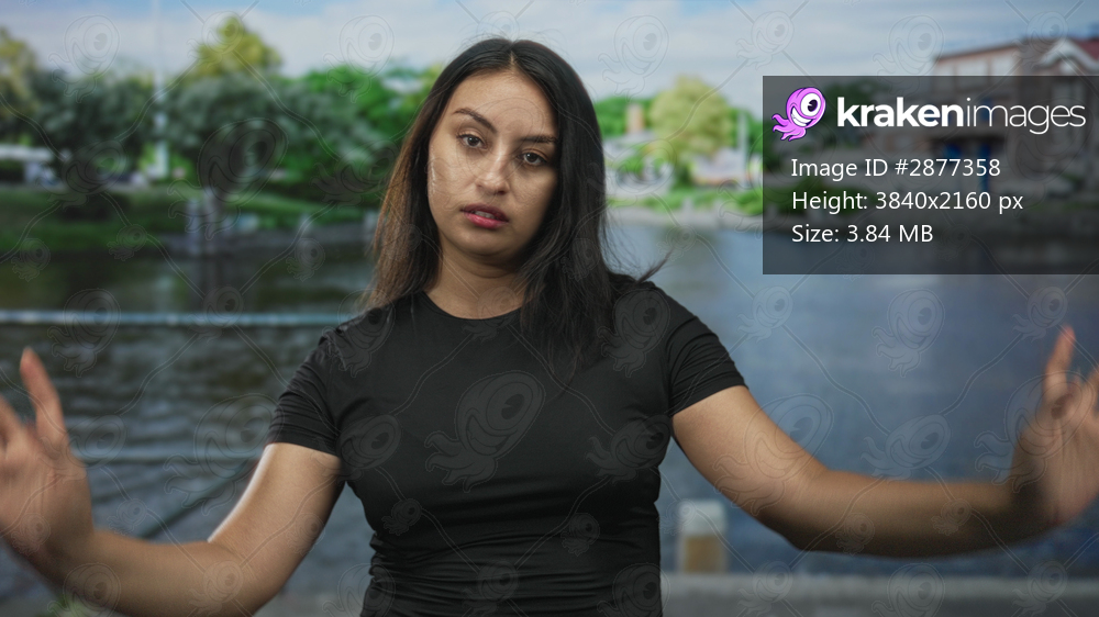 Woman with bare arms shrugging and hands raised, wearing a black tshirt, on a street by a canal in amsterdam; annoyance.