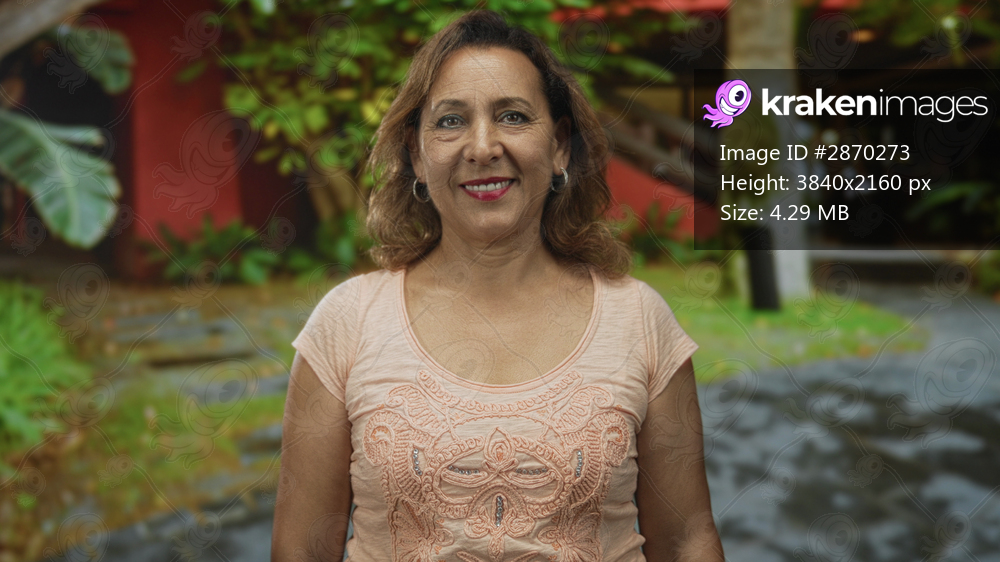 Woman with bare arms wearing a peach blouse stands before a building surrounded by greenery; serenity.