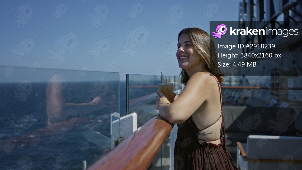 Woman with bare back holding iced cocktail and leaning on cruise railing on a building deck; calm vacation.