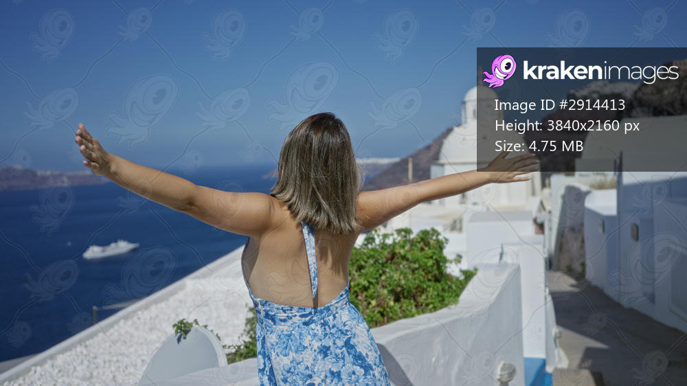 Woman with bare back and outstretched arms on a white church building terrace in santorini; serenity travel.