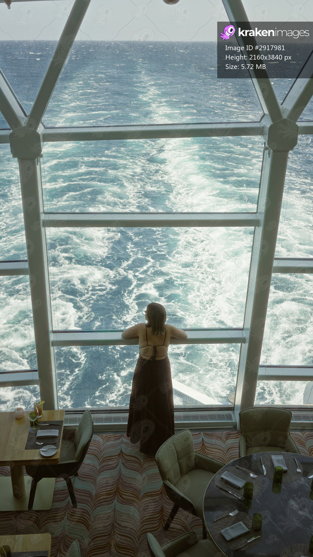 Woman with bare back standing with arms on railing at building window overlooking ship wake; quiet contemplation.