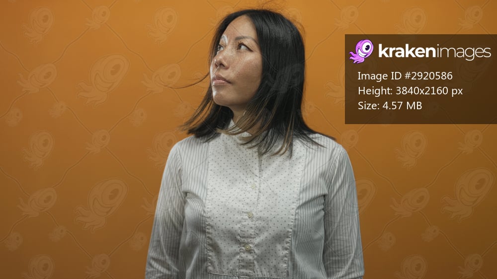 Woman with bare face and freckled skin smiling gently, hair blowing, wearing white blouse in studio; contentment acceptance resilience.