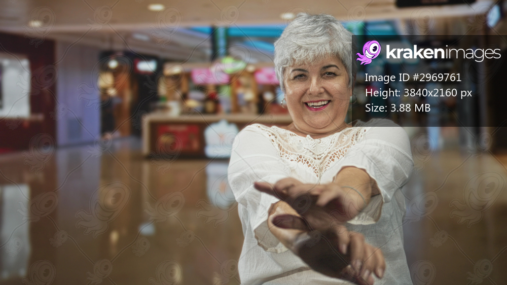 Woman with bare forearms reaching arms out in a busy shopping building, smiling with open hands and relaxed posture; joyful confidence.