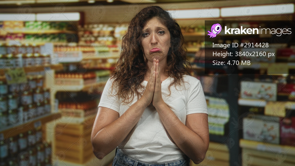 Woman with bare hands pressed together in prayer at supermarket building aisle, hands held at chest level, neutral expression; pleading.
