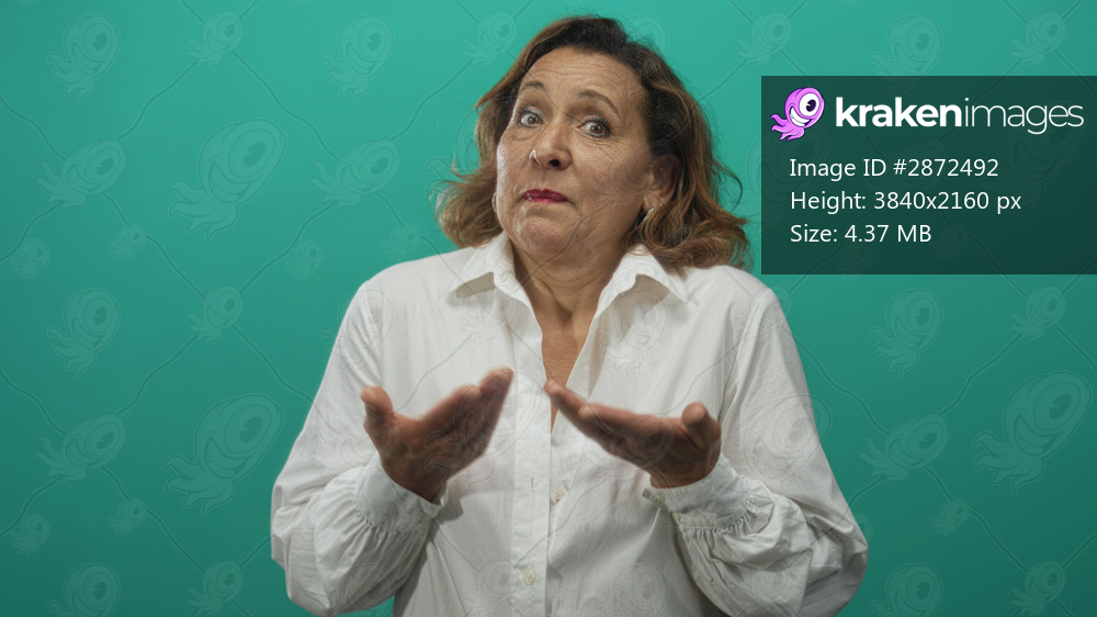 Woman with bare hands raised shrugs shoulders in green studio scene conveying a puzzled expression; uncertainty hesitation confusion.