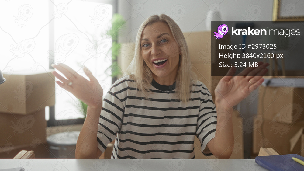 Woman with bare hands waving and smiling at camera at table amid moving boxes in building; warmth home transition.