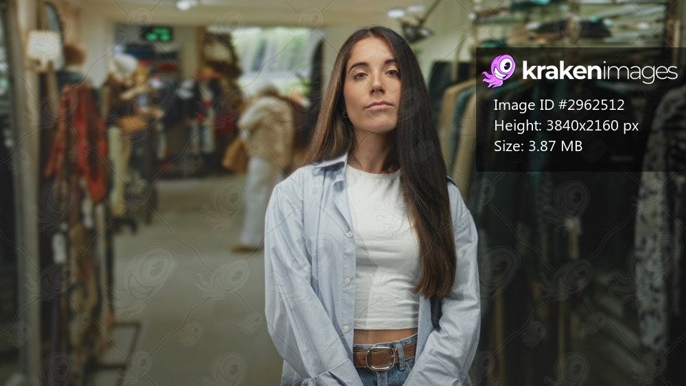 Woman with bare midriff and belt, hands clasped, looks up amid racks of clothes inside a clothing store building; pensive reflection.
