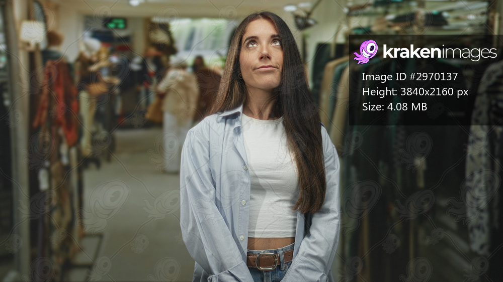 Woman with bare midriff and belt, hands clasped, looks up amid racks of clothes inside a clothing store building; pensive reflection.