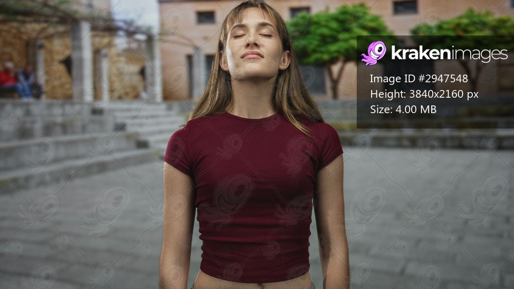 Woman with bare midriff and eyes closed wearing burgundy top standing in front of building on street; calm reflection.