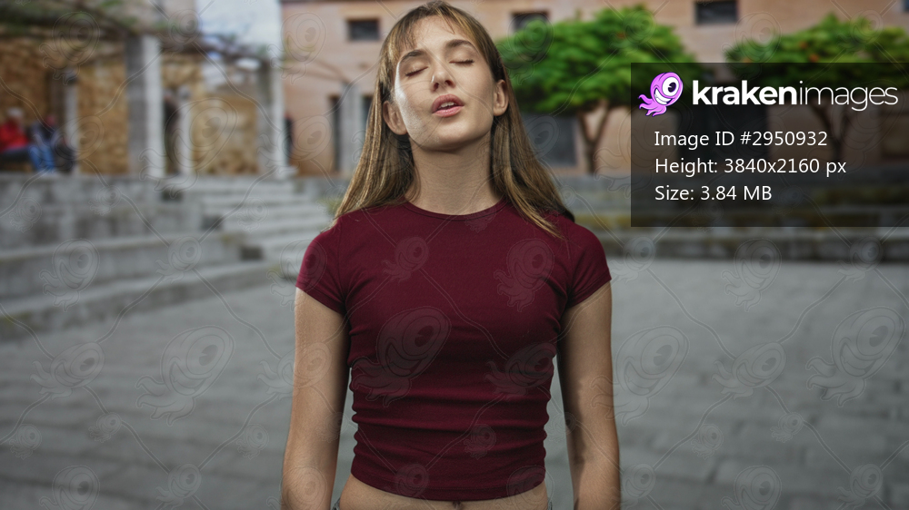 Woman with bare midriff and eyes closed wearing burgundy top standing in front of building on street; calm reflection.