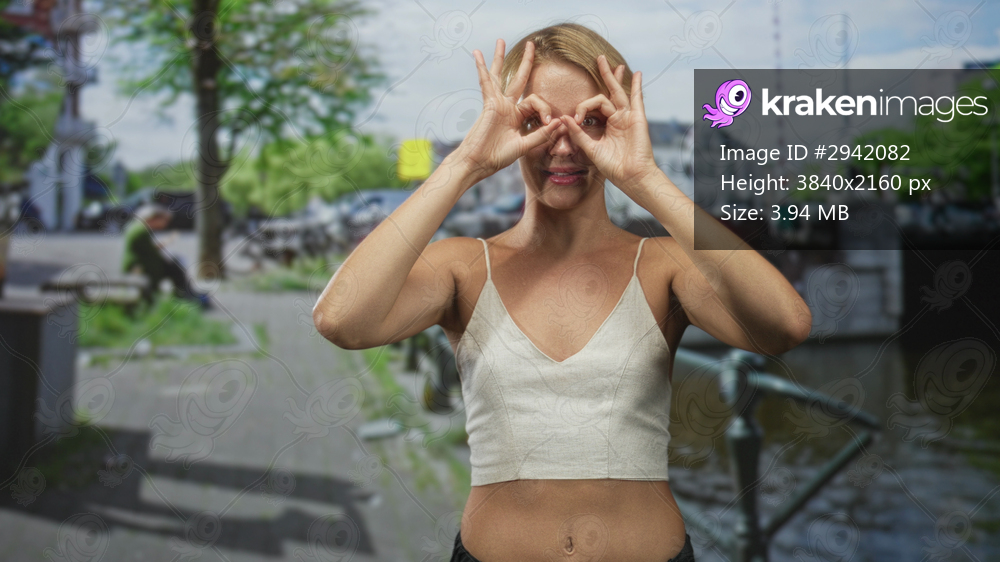 Woman with bare midriff makes circle gestures with fingers over her eyes on a street; playful curiosity.