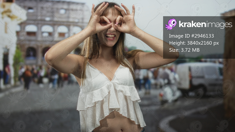 Woman with bare midriff making hand binoculars gesture on street by the coliseum building, smiling with tongue out; playful travel curiosity.