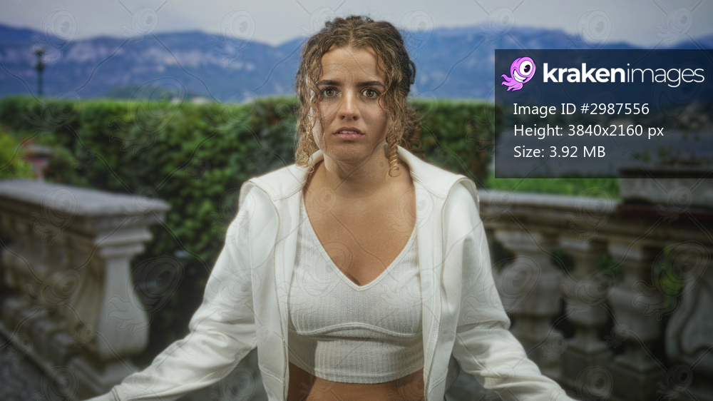 Woman with bare midriff and open palms shrugging on a stone terrace by a lake; uncertainty questioning.