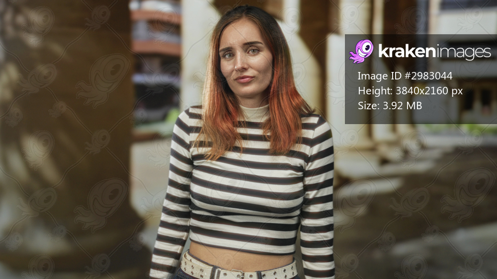Woman with bare midriff squints eyes and tilts head, wearing a striped crop top in a building colonnade; quiet contemplation.