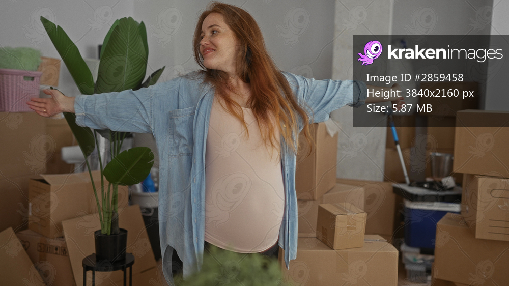 Woman with bare pregnant belly stretching arms inside building; motherhood anticipation family future.