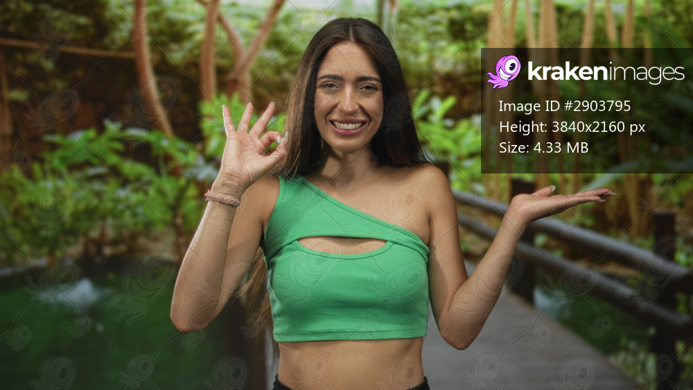 Woman with bare shoulder and midriff in a green crop top making ok sign with right hand while holding left palm up on a park wooden walkway; joy confidence. - Kraken Images