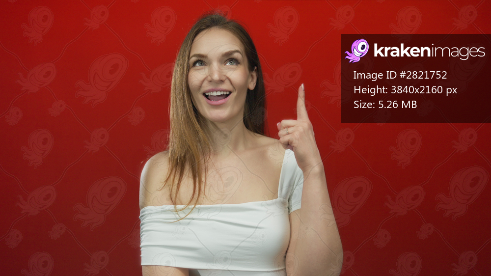 Woman with bare shoulder points finger at imaginary target in red studio; confidence inspiration optimism.