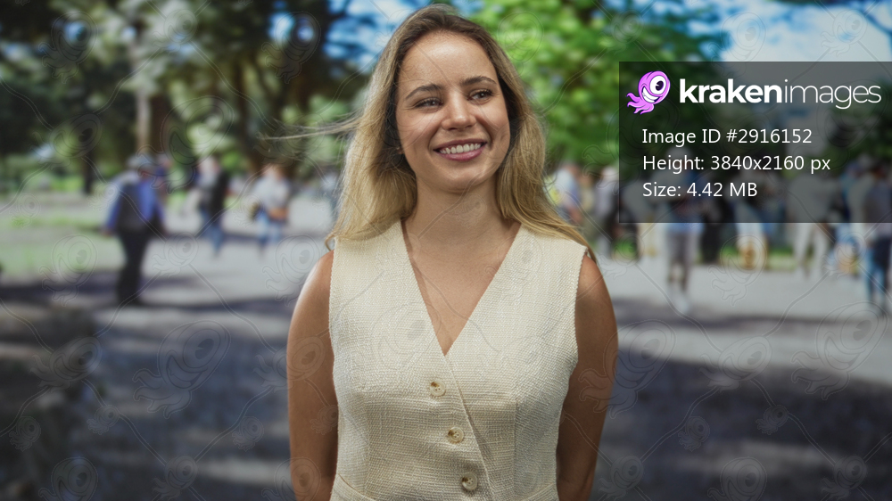 Woman with bare shoulder smiling on street near a park crowd, wearing a beige vest and buttons; joy confidence.