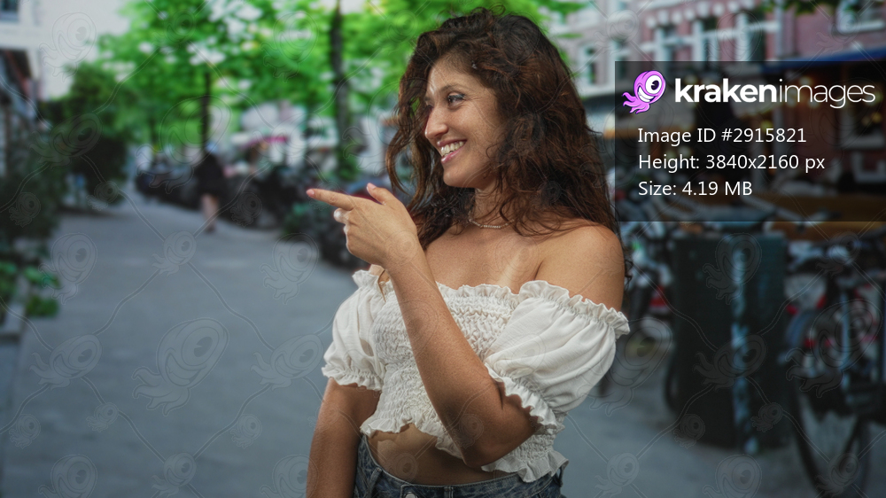 Woman with bare shoulders and freckled face smiling and pointing finger on busy city street near bicycles and cafe lights; confidence joy summer.