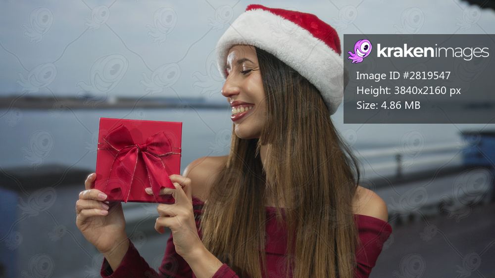 Woman with bare shoulders holds red gift box and smiles on seaside street; holiday celebration warmth cheer.