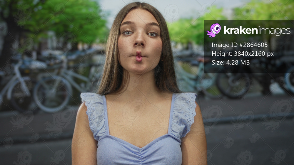 Woman with bare shoulders in pastel blue top puckers lips on street lined with bicycles; playfulness.