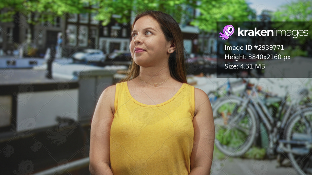 Woman with bare shoulders in yellow tank top on street by canal and parked bicycles looking up at sky; serenity reflection pause.