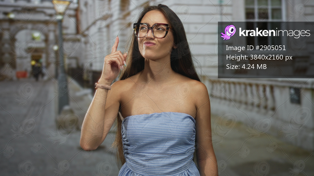 Woman with bare shoulders pointing finger up on street in blue strapless dress smiling and wearing glasses; confidence optimism.