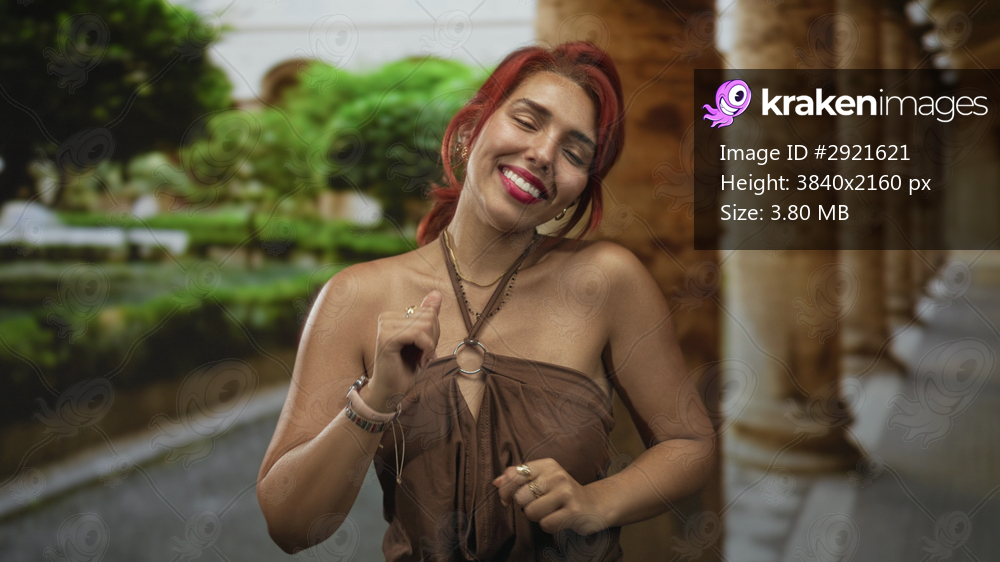 Woman with bare shoulders smiling with eyes closed and hands clasped near chest in a building colonnade; joyful celebration.