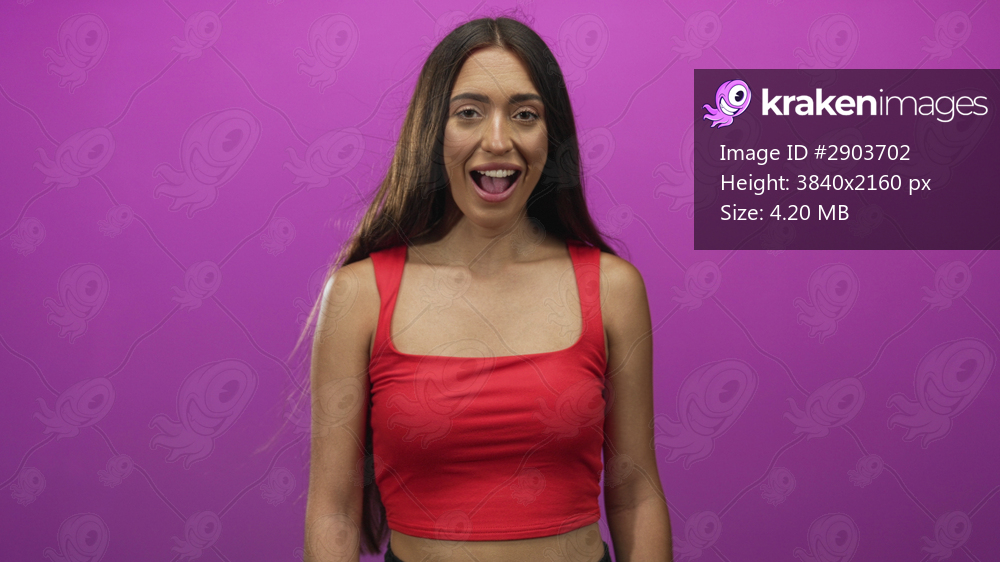 Woman with bare shoulders smiling with mouth open and looking aside in purple studio; joyful playfulness.
