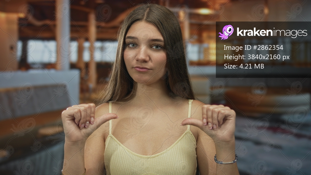 Woman with bare shoulders and thumbs pointing to chest and neutral expression in a building interior; self confidence.