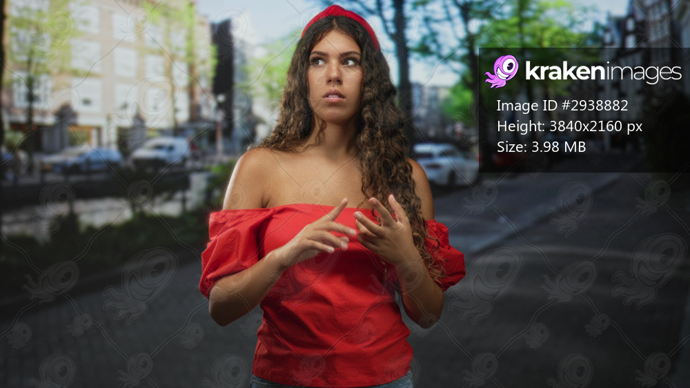 Woman with bare shoulders touching fingers on street by a canal and buildings, wearing red blouse and headband; quiet contemplation.