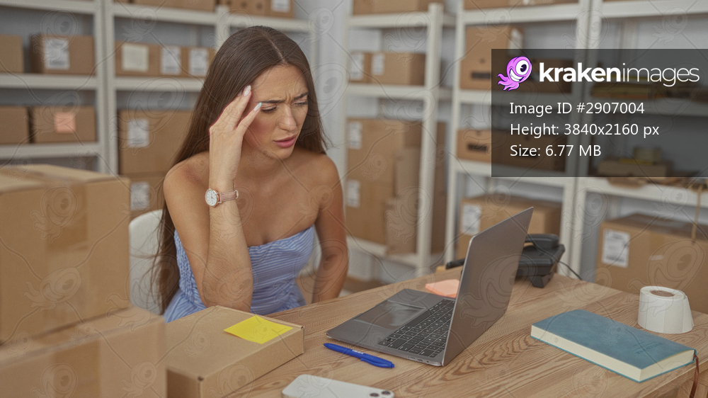 Woman with bare shoulders typing on laptop amid stacked parcel boxes while holding head for headache in building; stress entrepreneurship.
