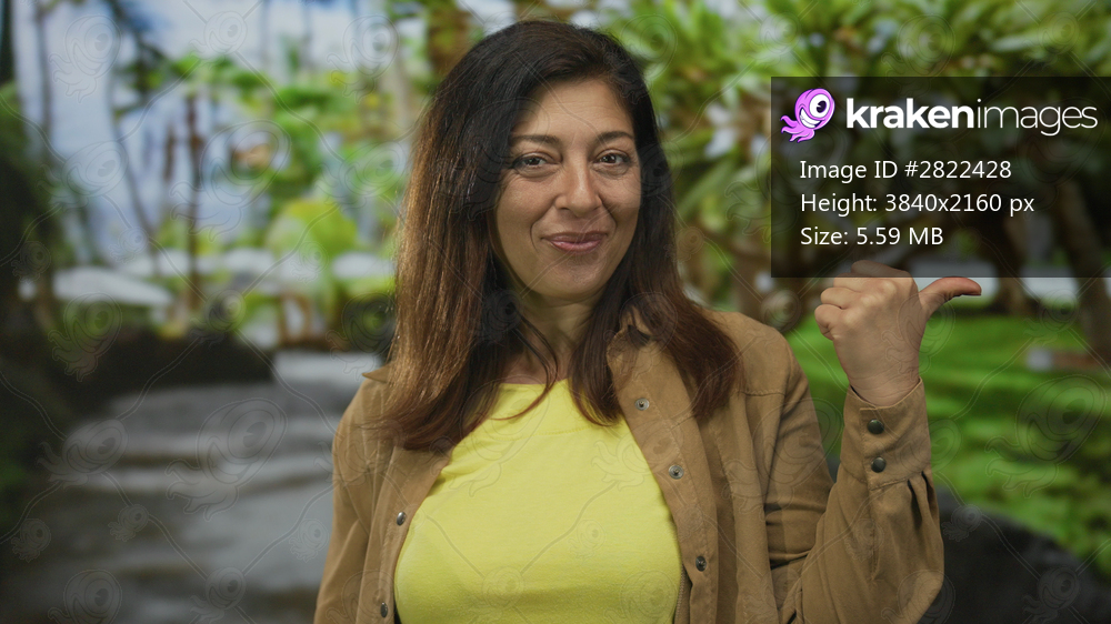 Woman with bare thumb casually pointing sideways in green forest setting; confidence.
