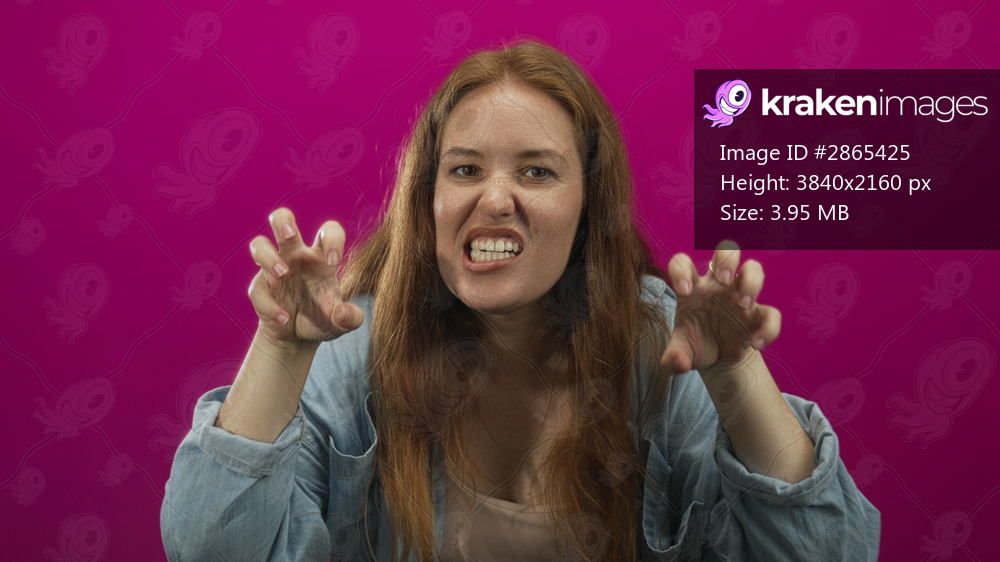 Woman with bared teeth snarling with raised hands in pink studio; anger defiance intensity ferocity.
