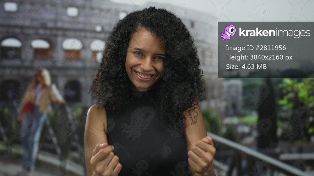 Woman beckons with bare hand on outdoor street near roman coliseum in bright daylight; friendly invitation.