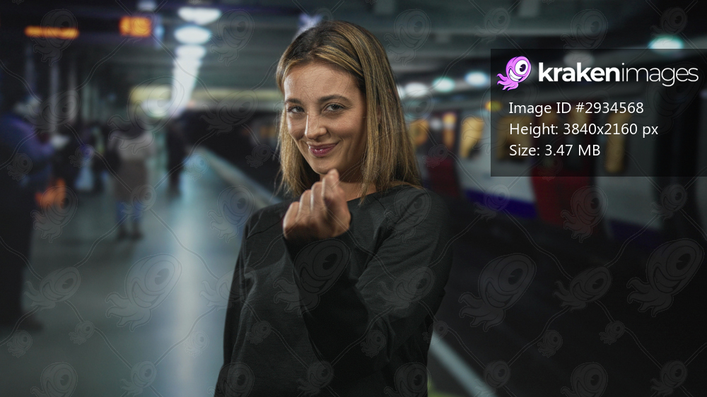 Woman beckons with finger on a crowded train platform inside a building, winking and smiling; playful invitation.